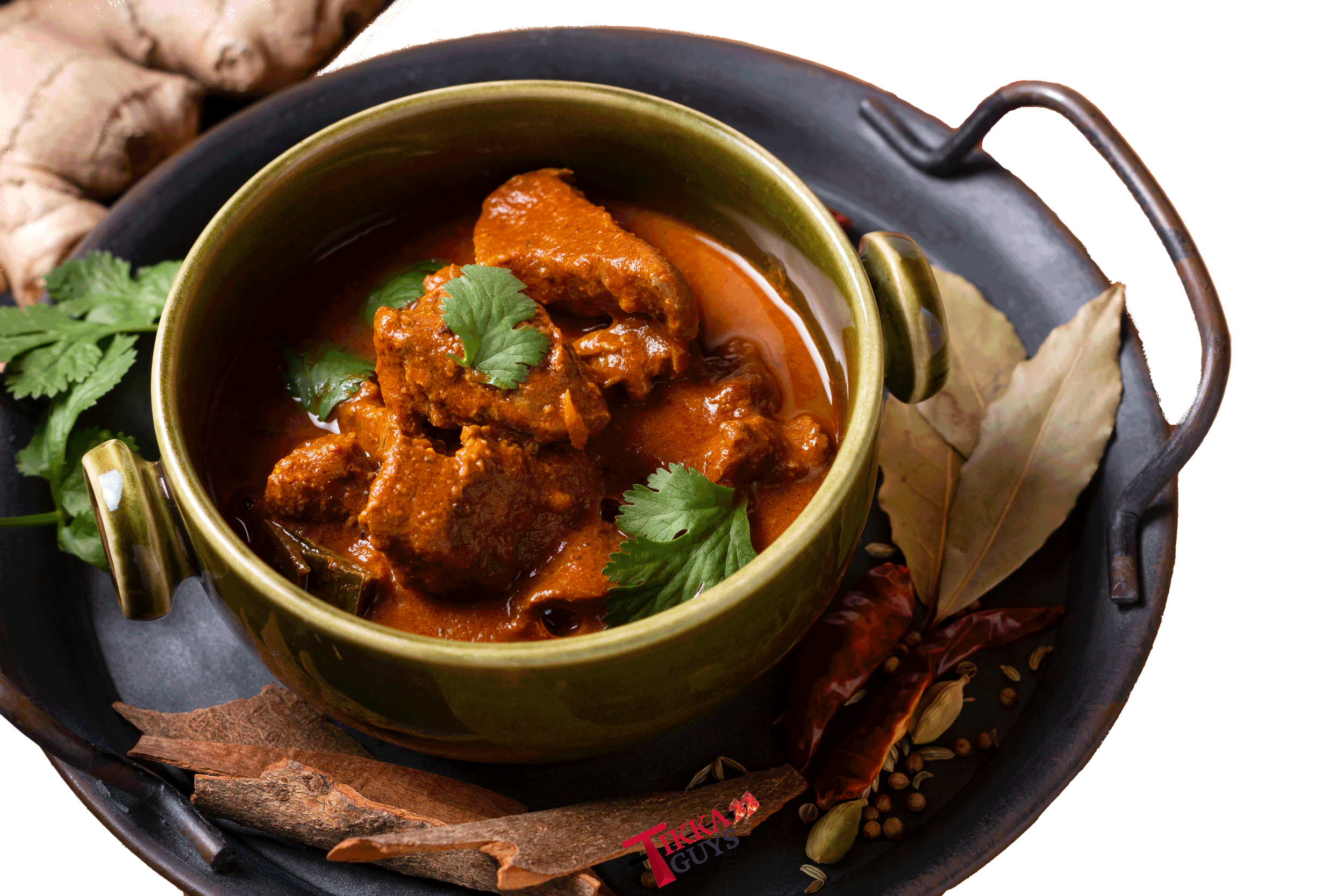 This dish is cooked using mutton, tomatoes, ginger, garlic, and water. In the wok, all of the ingredients are deep-fried together. after the meat gets tender and is separated from the oil while frying. The dish is ready at that point to be served hot from the wok.